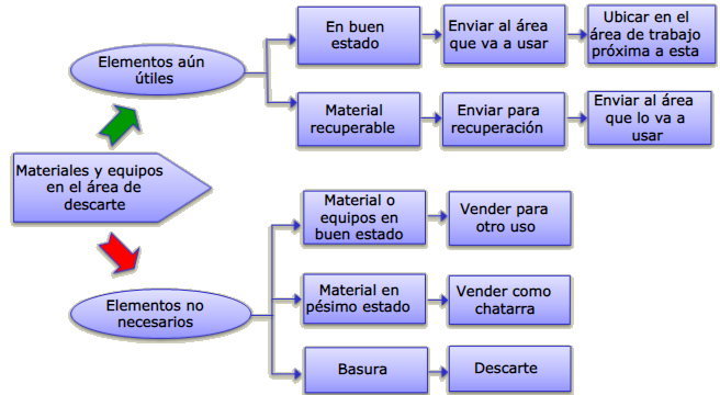 Lo que identifiquemos como innecesario debe retirarse y colocarse en un área de descarte, fuera de los espacios de trabajo. Podemos definir una única área de descarte para todos los sectores productivos, o para todas las oficinas, por ejemplo. Ese área de descarte es un sector de transición. Lo que tengamos allí puede tener muchos destinos diferentes, en función de su estado y utilidad.